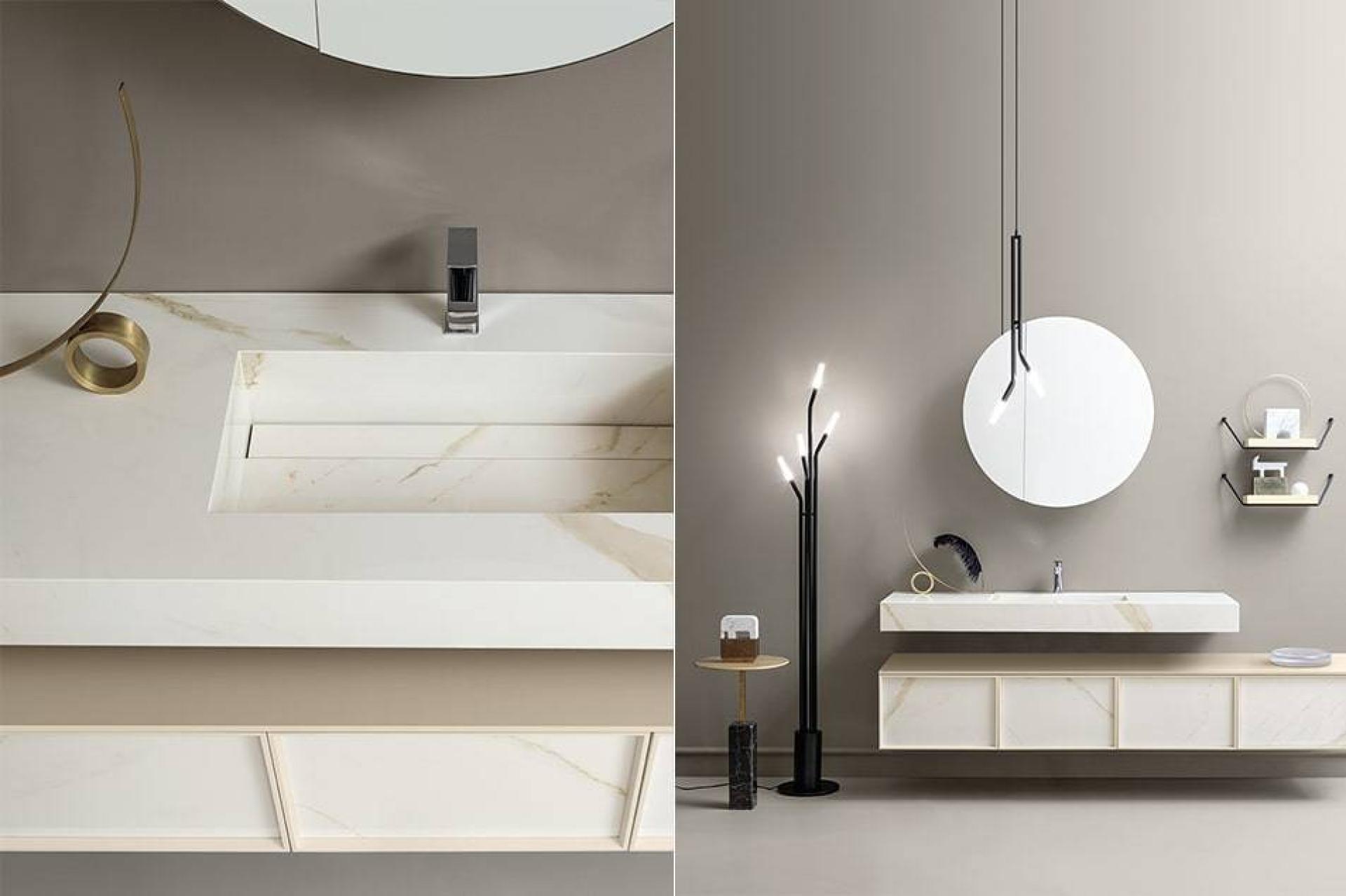 Composition suspendue avec vasque intégrée sur le plan en Laminam®. La structure du meuble sous vasque et des colonnes est en élégant laqué mat Bianco Crema (RAL 9001), qui s’alterne sur les façades avec le Laminam® dans la même finition Calacatta Oro que le plan. Mitigeur Cloud 1 en finition Chrome. Armoire ronde avec miroir éclairé par Twins, lampe avec tige en métal Nero mat, détail repris des étagères coordonnées.